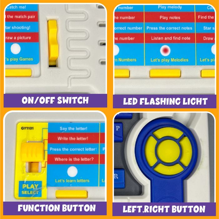 Insert 3 AA batteries, switch on the toy, and let your child explore learning activities using the keyboard and game buttons.
