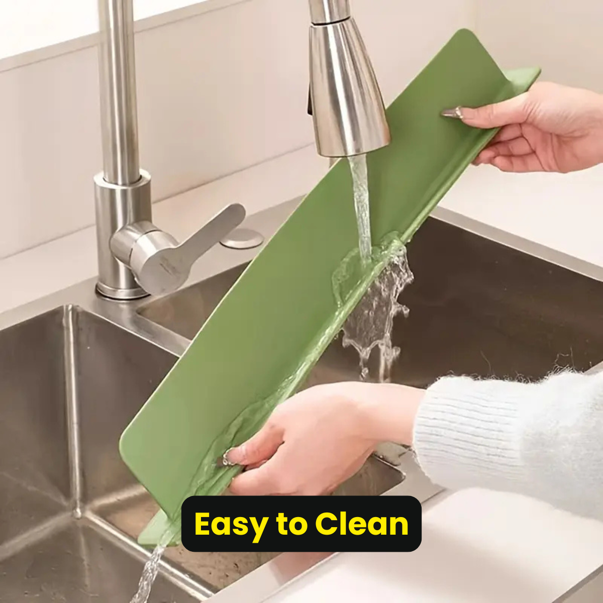 SinkShield™ is a flexible silicone splash guard that prevents water splashes while washing dishes, keeping your kitchen countertop clean and dry.